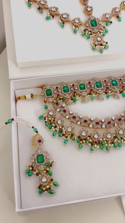 - Bridal Set Includes Choker, Necklace, Earrings, Tikka, Jhumar, Nose Ring