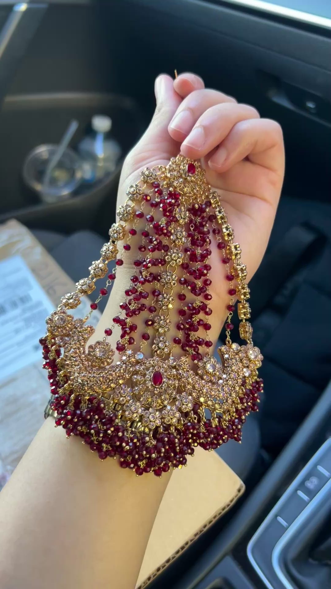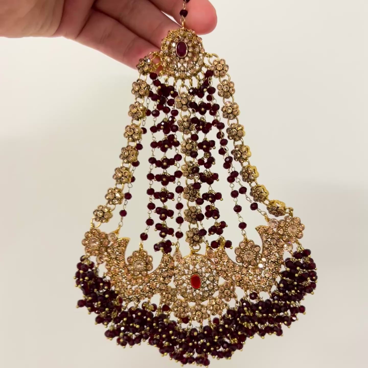 Introducing the Faiza Bridal Set - This stunning custom-made creation is designed to make any bride-to-be feel absolutely radiant. Adorned with rich, deep maroon beads that pop beautifully against a luxurious dark gold base