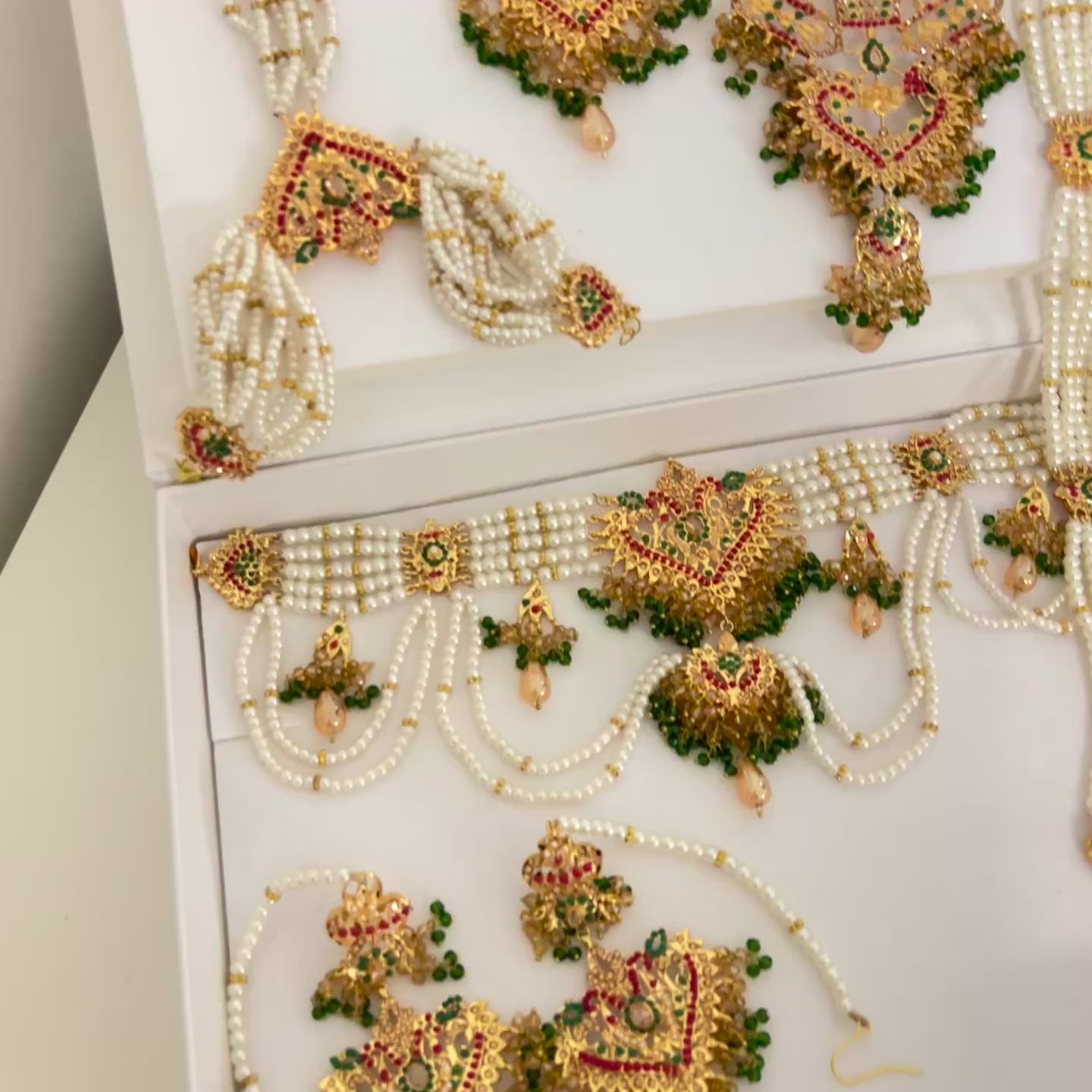 Introducing the Maheen Bridal Set – your soon-to-be-bride's dream come true! This stunning 6-piece collection is fit for royalty, featuring elegant pieces adorned with lustrous pearls. Make a grand entrance with grace and glamour!