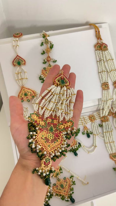 Introducing the Maheen Bridal Set – your soon-to-be-bride's dream come true! This stunning 6-piece collection is fit for royalty, featuring elegant pieces adorned with lustrous pearls. Make a grand entrance with grace and glamour!