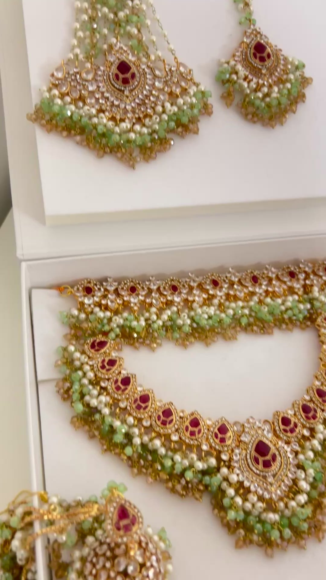 Introducing the Maryam Bridal Set – the viral sensation every bride has been waiting for! This stunning limited-edition collection features three exquisite necklaces, each beautifully paired with matching earrings, tikka, and jhumar to complete your wedding day look. Crafted for the modern bride who wants that perfect blend of traditional elegance and contemporary style, this set ensures you'll shine from every angle.